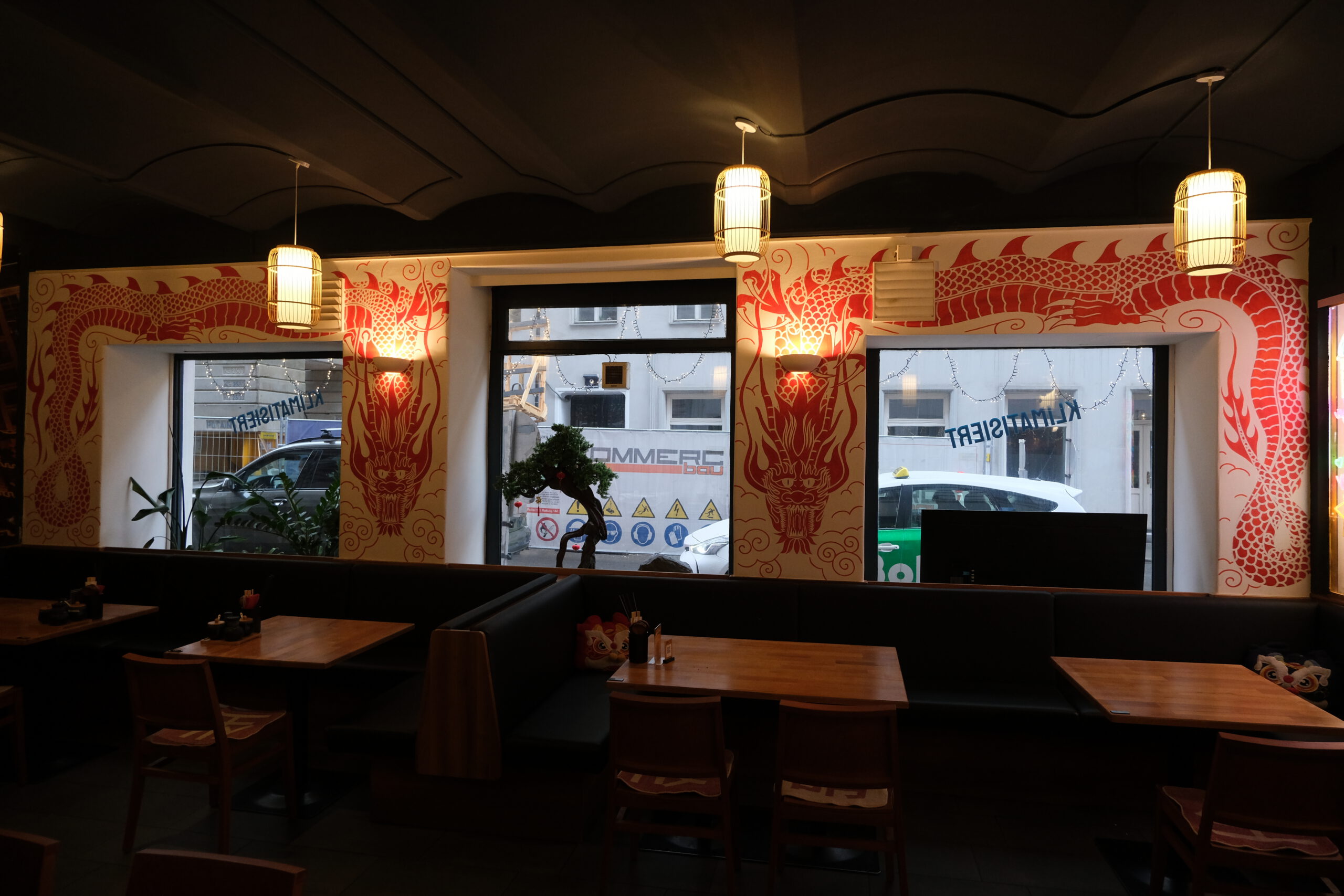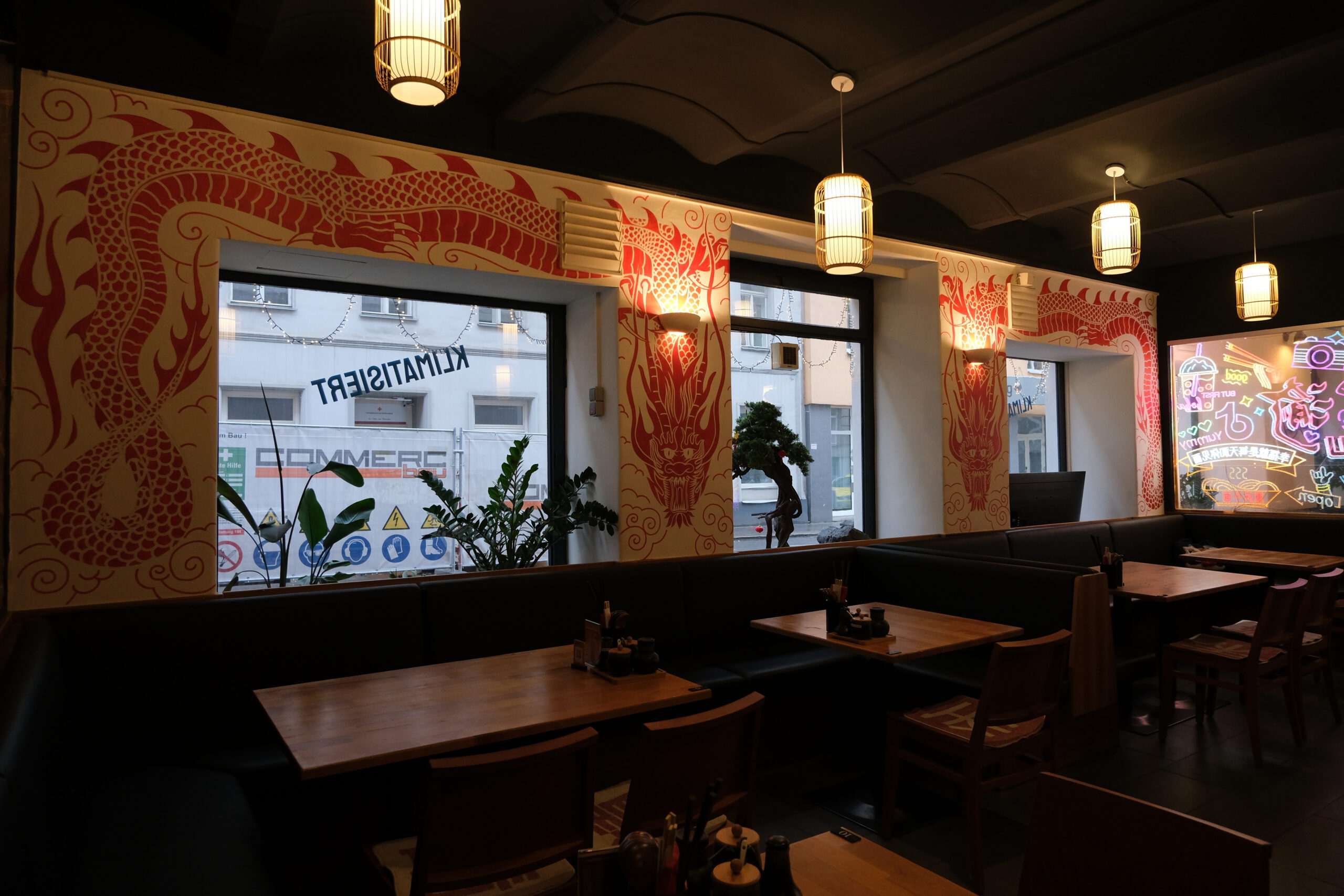 This mural features traditional Chinese dragons, symbols of strength, wisdom, and good fortune. Set within the atmosphere of a hotpot restaurant, the artwork connects the dining experience to a deeper cultural heritage. In Chinese tradition, dragons are revered as powerful and auspicious beings, often associated with prosperity and protection. Their presence here adds a meaningful layer to the space, reflecting the richness of the culture behind the cuisine.